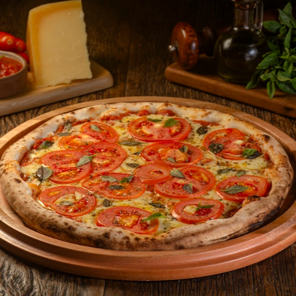 Molho de Tomate, Queijo Mussarela, Tomate Fatiado, Orégano e Manjericão.