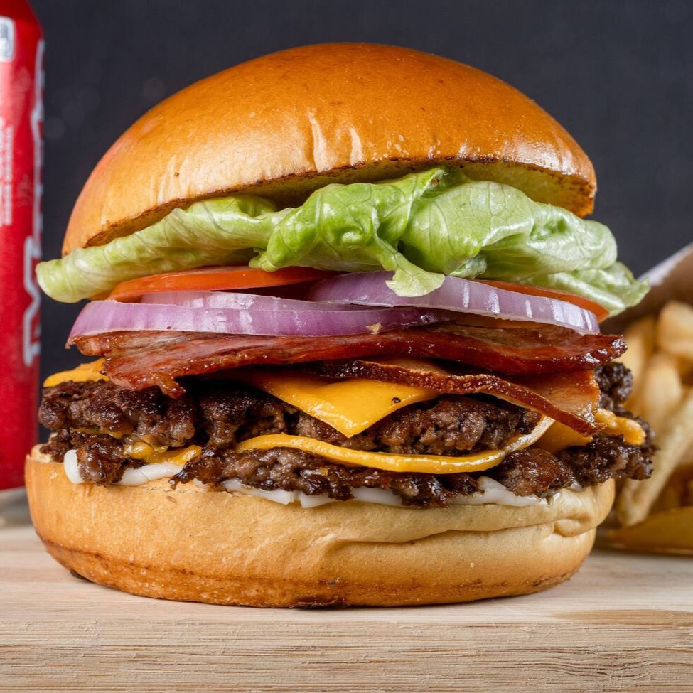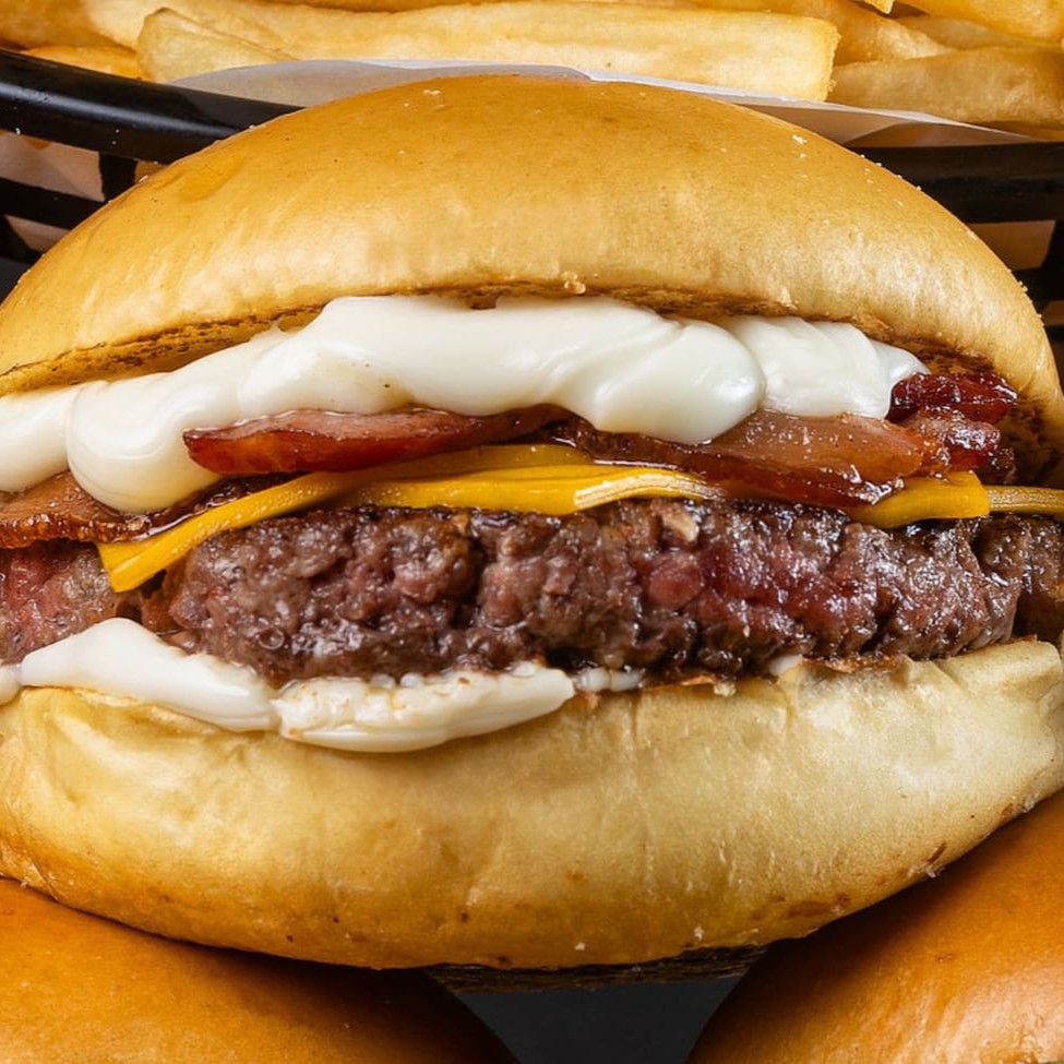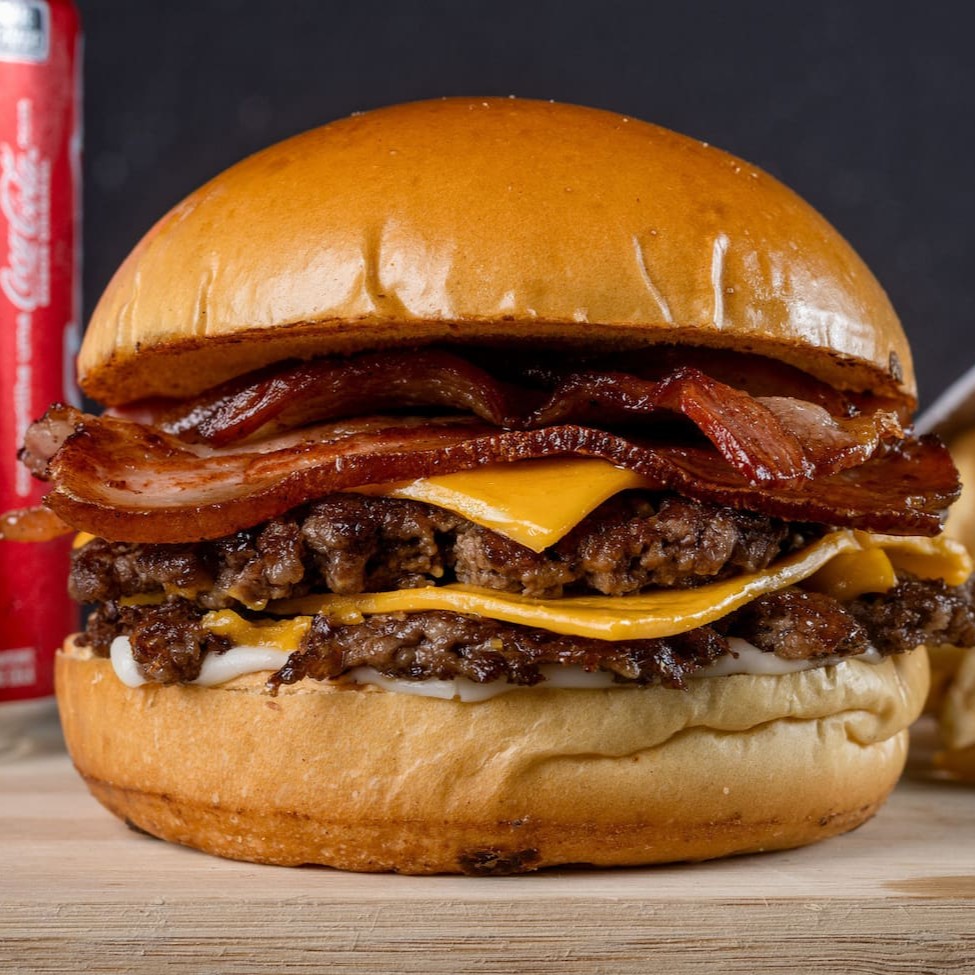 Duplo smash bacon poderoso: 2 blends de 70g de carne artesanal (140g), 2 fatias de cheddar, bacon crocante e molho grill no pão brioche macio. Sabor intenso, crocância extra e suculência na medida certa — o campeão que não deixa ninguém na vontade!