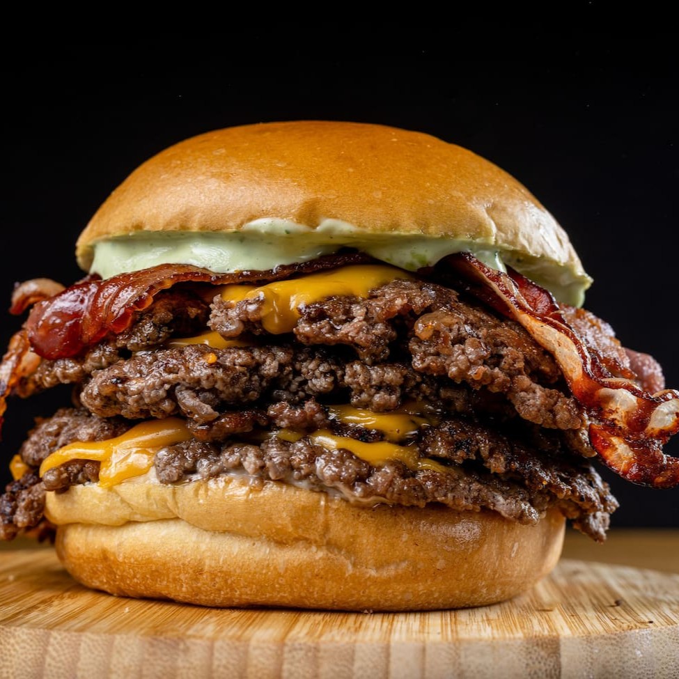 O gigante do cardápio! 4 blends de 70g de carne artesanal (280g), 4 fatias de cheddar derretido, bacon crocante e maionese verde no pão brioche macio. “Não quero dinheiro… só quero esse smash!” Exagerado, suculento e apaixonante — feito pra quem ama comer de verdade.