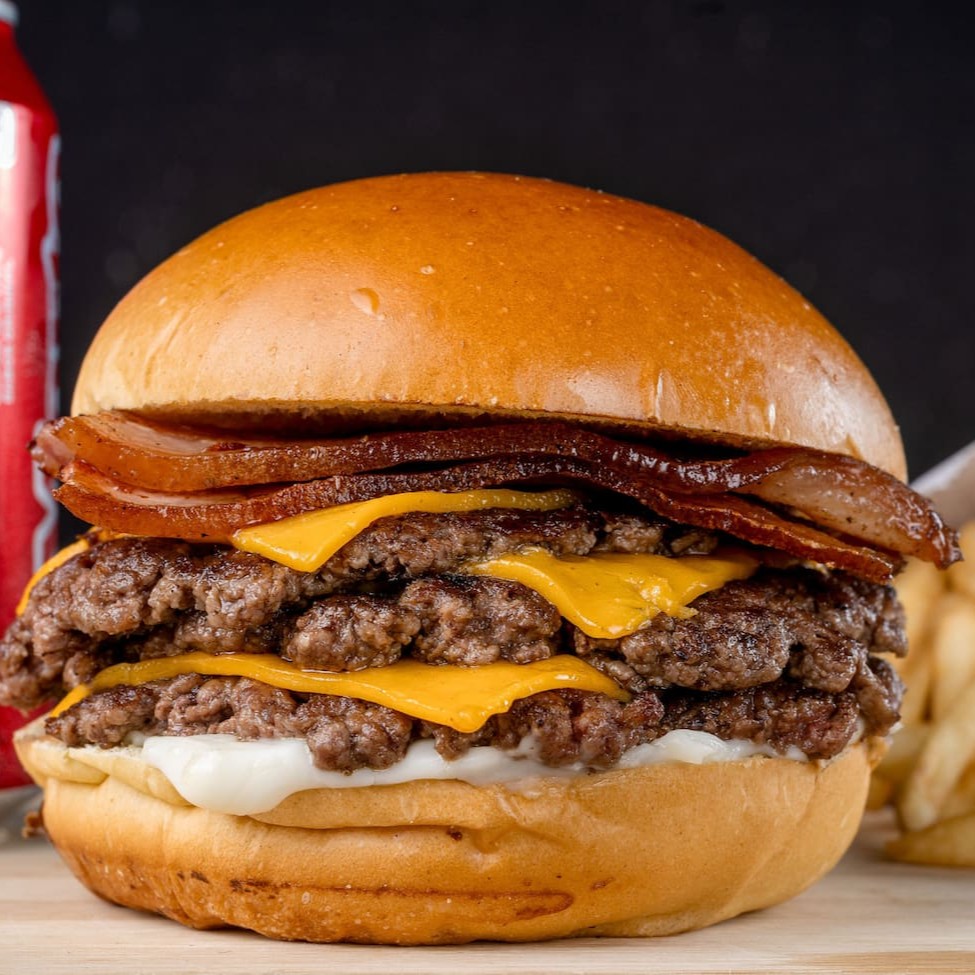 Triplo smash com peso e atitude: 3 blends de 70g de carne artesanal (210g), 3 fatias de cheddar derretido e molho grill no pão brioche macio. Marcante, suculento e sem enrolação — pra quem tem muita fome e exige sabor de verdade.