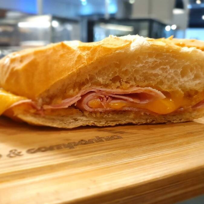 Baguetinha da casa vestida de misto quente. Queijo e presunto