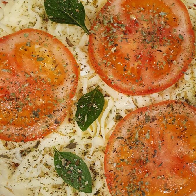Massa de pizza P&C, mussarela, tomate em rodelas, orégano e manjericão. Tamanho brotinho.