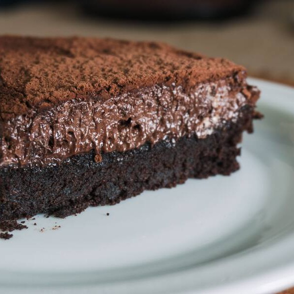 Torta tipo mousse, trufada meio amarga. Clássica e elegante.