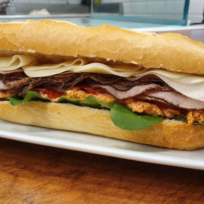 Baguetinha, pasta de tomate seco, roastbeef,mussarela,rúcula e tomate seco.