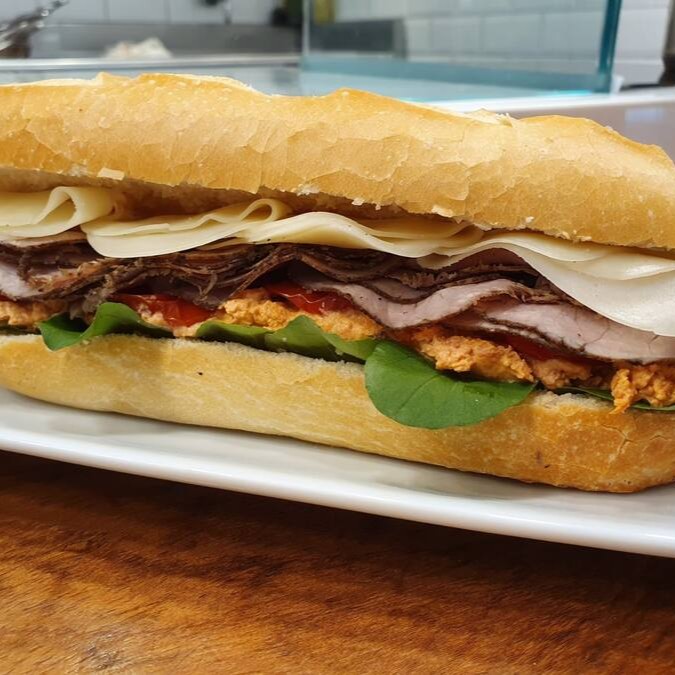 Baguetinha, pasta de tomate seco, rosbife, mussarela, rúcula e tomate seco.