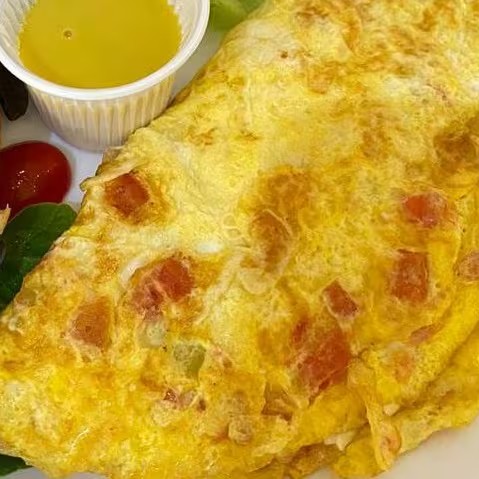 Omelete recheado do jeitinho que você gosta. Salada e molho meramente ilustrativos.