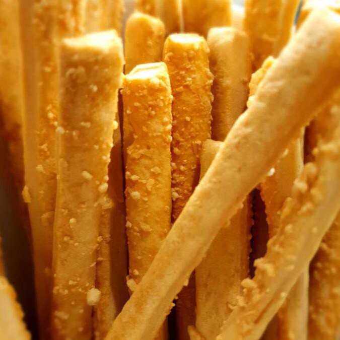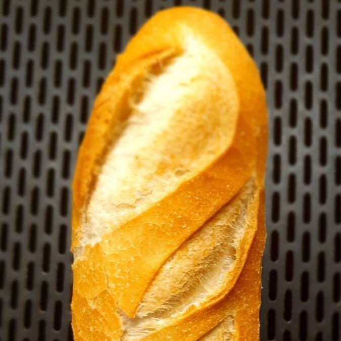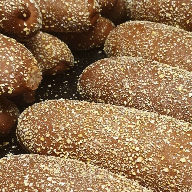 Pão em formato de baguetinha, fofinho, com sabor levemente adocicado e cor escura apurados pelo cacau e melado de cana utilizados na massa.