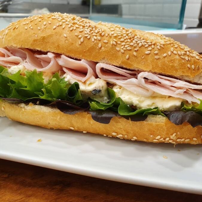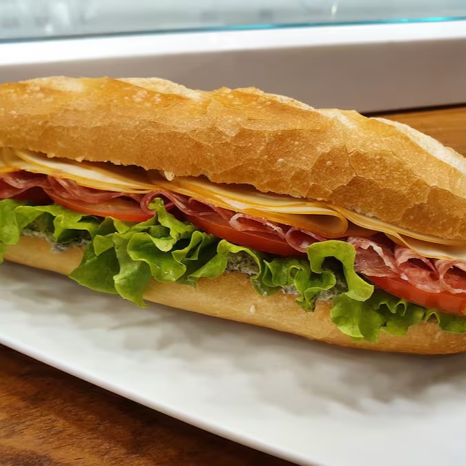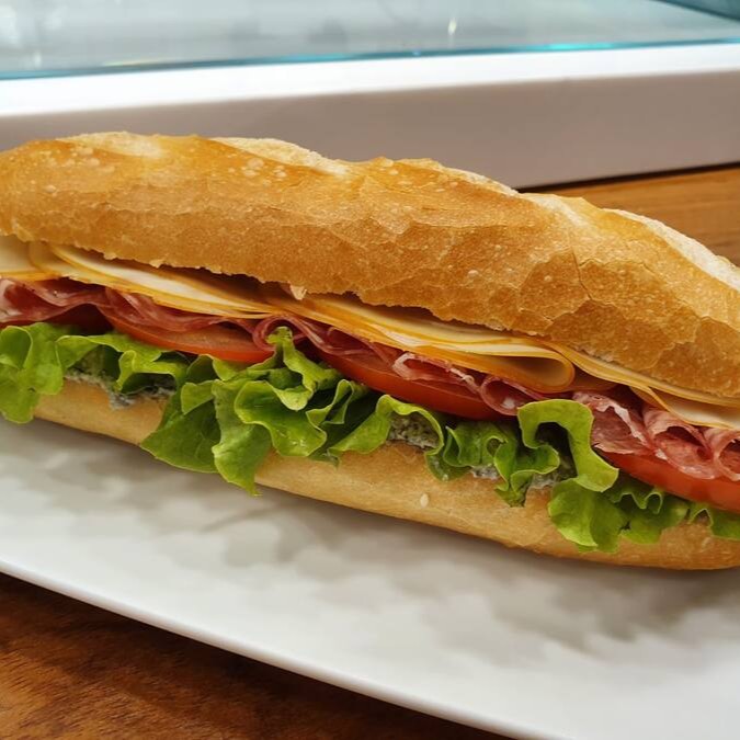 Nossa baguete francesa (aprox. 65 cm), recheada ao gosto do freguês. Opções a seguir. Rende aprox. 16 a 18 fatias (baguete vem inteira, cliente corta), ideal para lanches de grupos ou familiares.