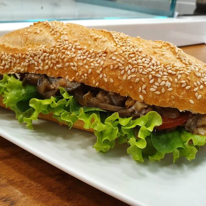 Baguetinha, pasta de azeitona preta, salaminho, provolone, mix de folhas e tomate.