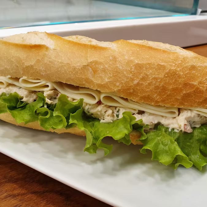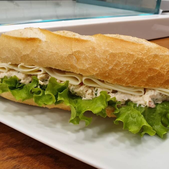 Baguetinha, Salada de galinha,queijo minas padrão e folhas.