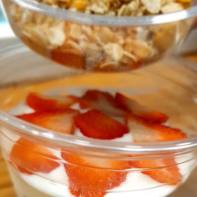 Iogurte grego intercalado com chia hidratada, geléia artesanal e caroçuda de morango e frutas frescas Acompanha granola.