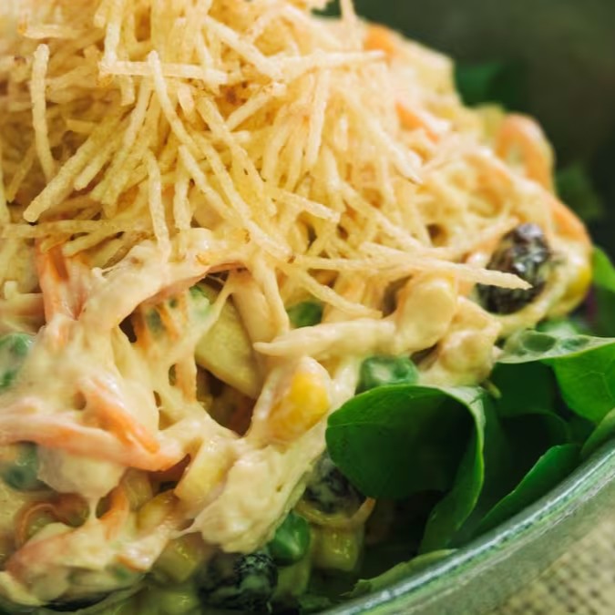Mix de folhas e salpicão da casa. Acompanha batata palha.