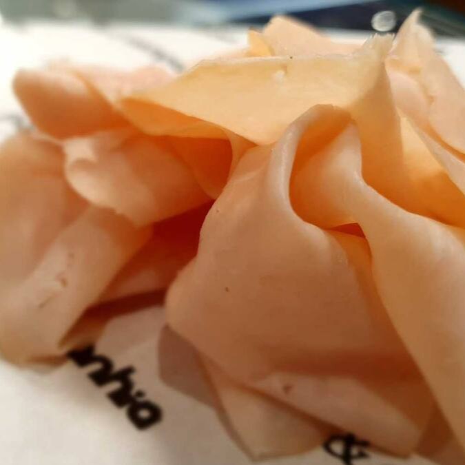 Baguetinha: Cremoso de abacaxi com amêndoas, presunto royal e folhas.