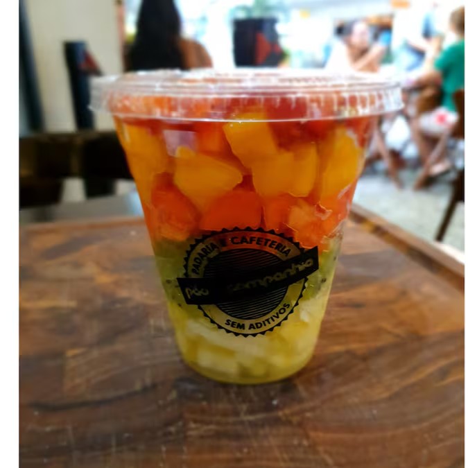 Nossa salada de frutas, fresquinha! Abacaxi, manga, mamão, kiwi, morango cortados em cubinhos. *Frutas podem sofrer alteração conforme sazonalidade.