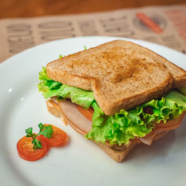 Pão de forma integral, pasta natural, peito de peru, alface e tomate