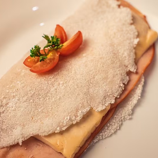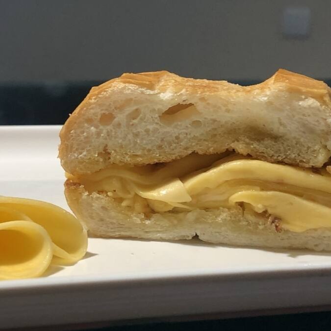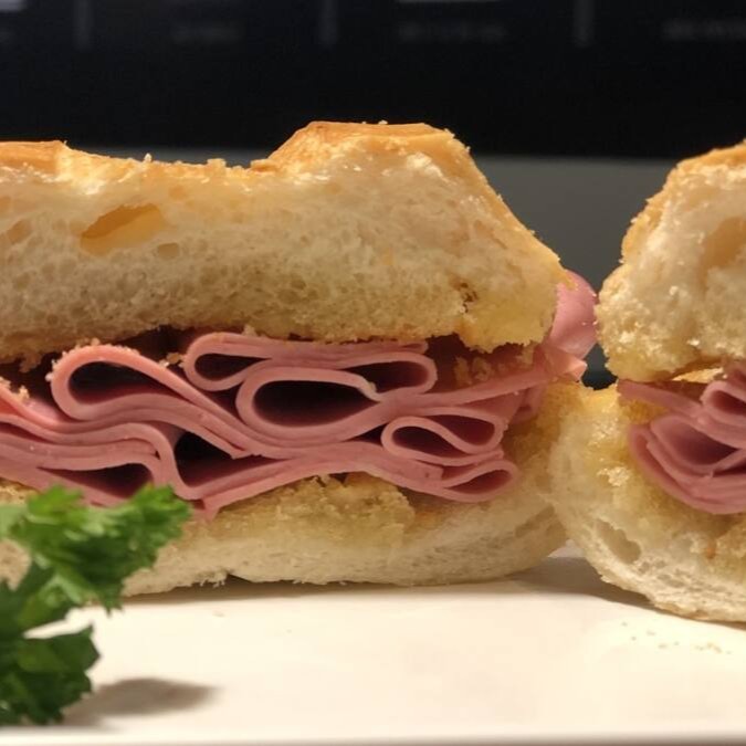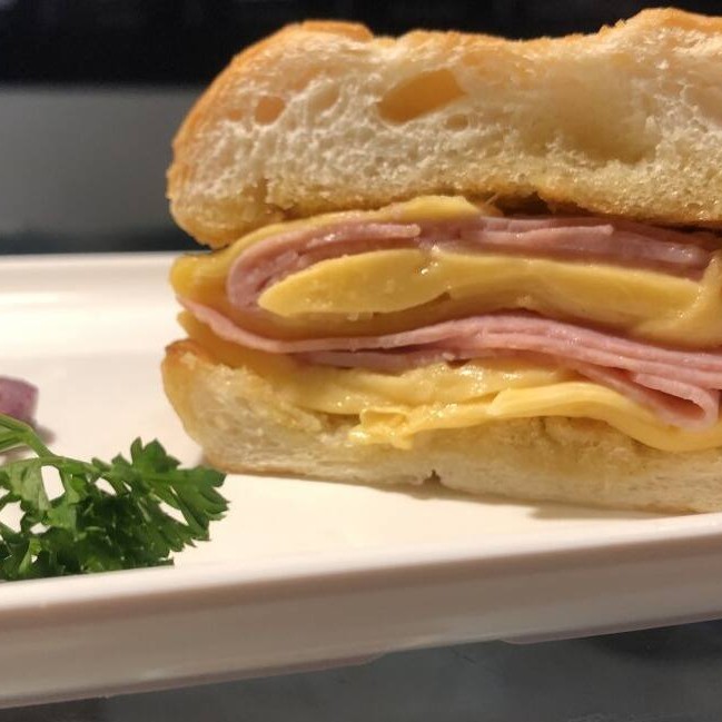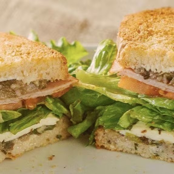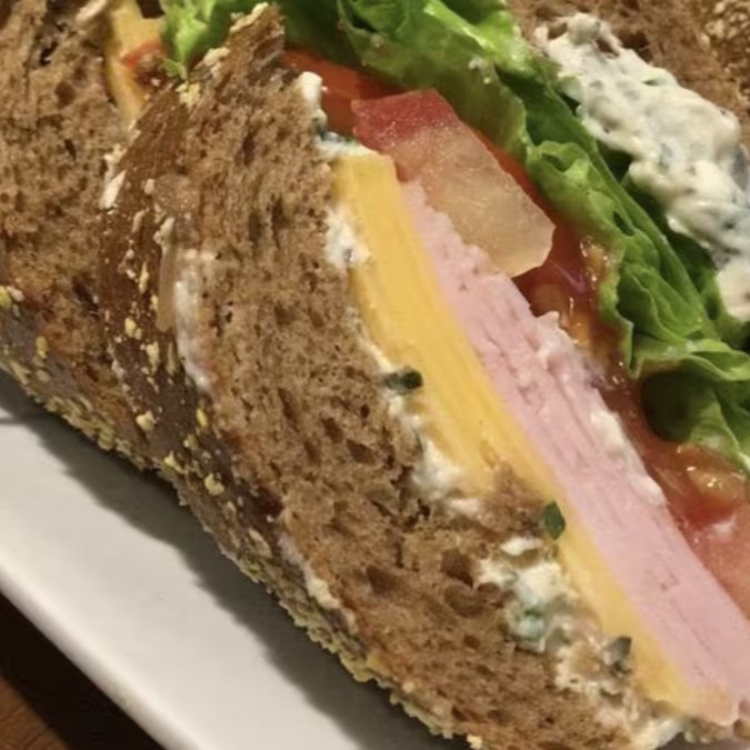 Uma combinação deliciosa de pão australiano, queijo prato, patê de ricota com ervas, lombinho canadense, alface e tomate.