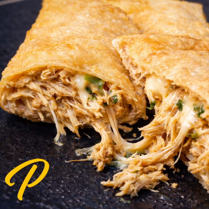 Frango, Queijo, Ctupiry. Frango cozido lentamente e desfiado de forma artesanal, temperado com um refogado de cebola, alho e um toque de colorau para aquela cor e sabor irresistíveis. Um recheio úmido e farto que combina perfeitamente com a nossa massa secreta. Simplesmente delicioso!