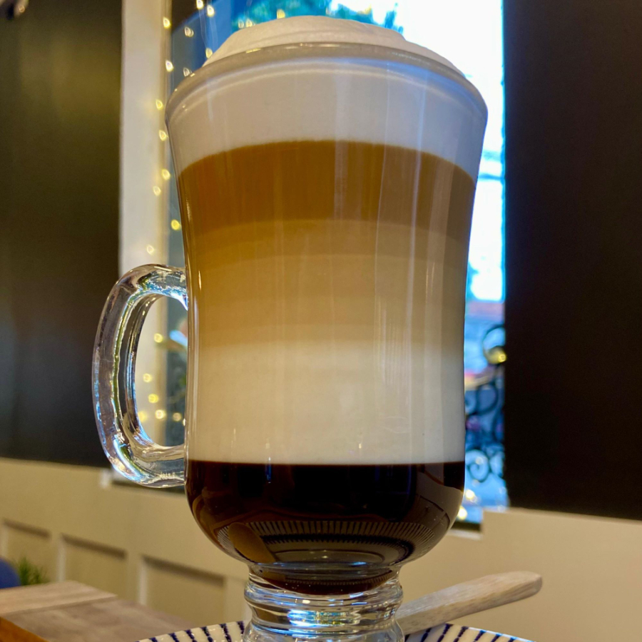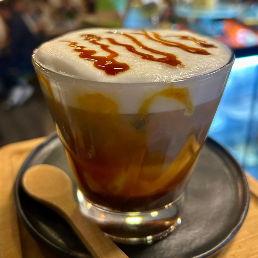 CARAMELO, EXPRESSO, LEITE VAPORIZADO, CREMA DO LEITE E CALDA DE CARAMELO
