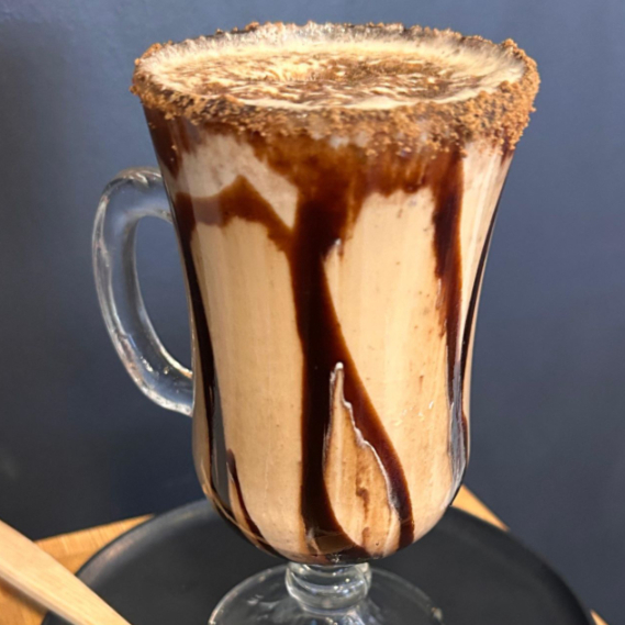 EXPRESSO BATIDO COM LEITE E GELO, CALDA DE CHOCOLATE E FAROFA DE COOKIE