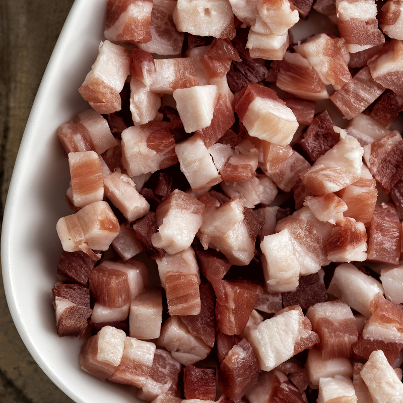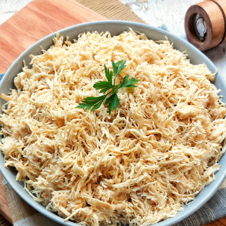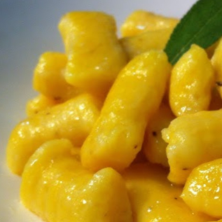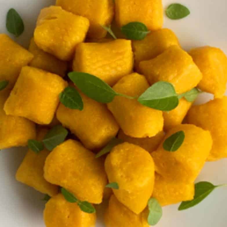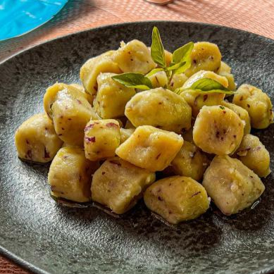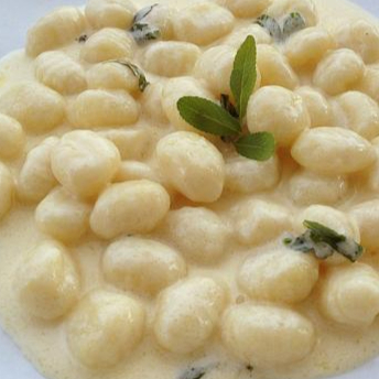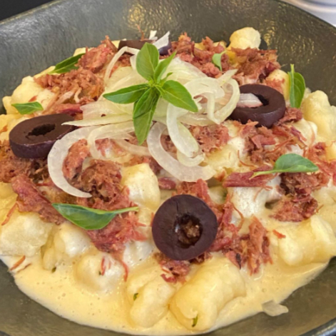 Gnocchi de abóbora ou aipim ao molho quatro queijos com carne seca desfiada, cebola, azeitonas pretas fatiadas e folhas frescas de manjericão.