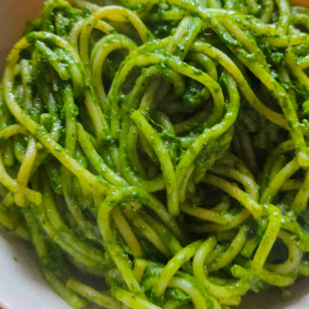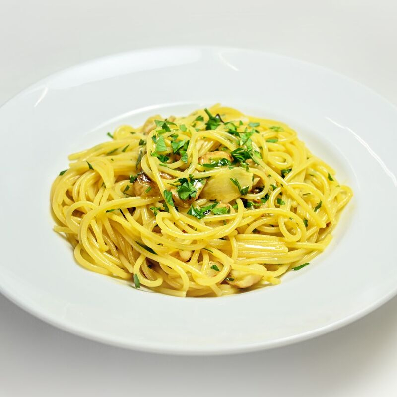 Spaghetti tradicional regado ao azeite português aromatizado com alecrim fresco e crisps de alho frito