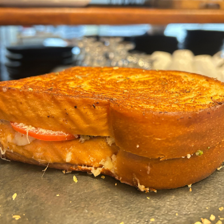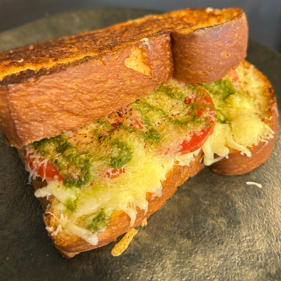 PÃO DE FORMA PETRÓPOLIS COM MUÇARELA, PARMESÃO, TOMATE ITALIANO, MOLHO PESTO DA CASA, MANJERICÃO E ORÉGANO