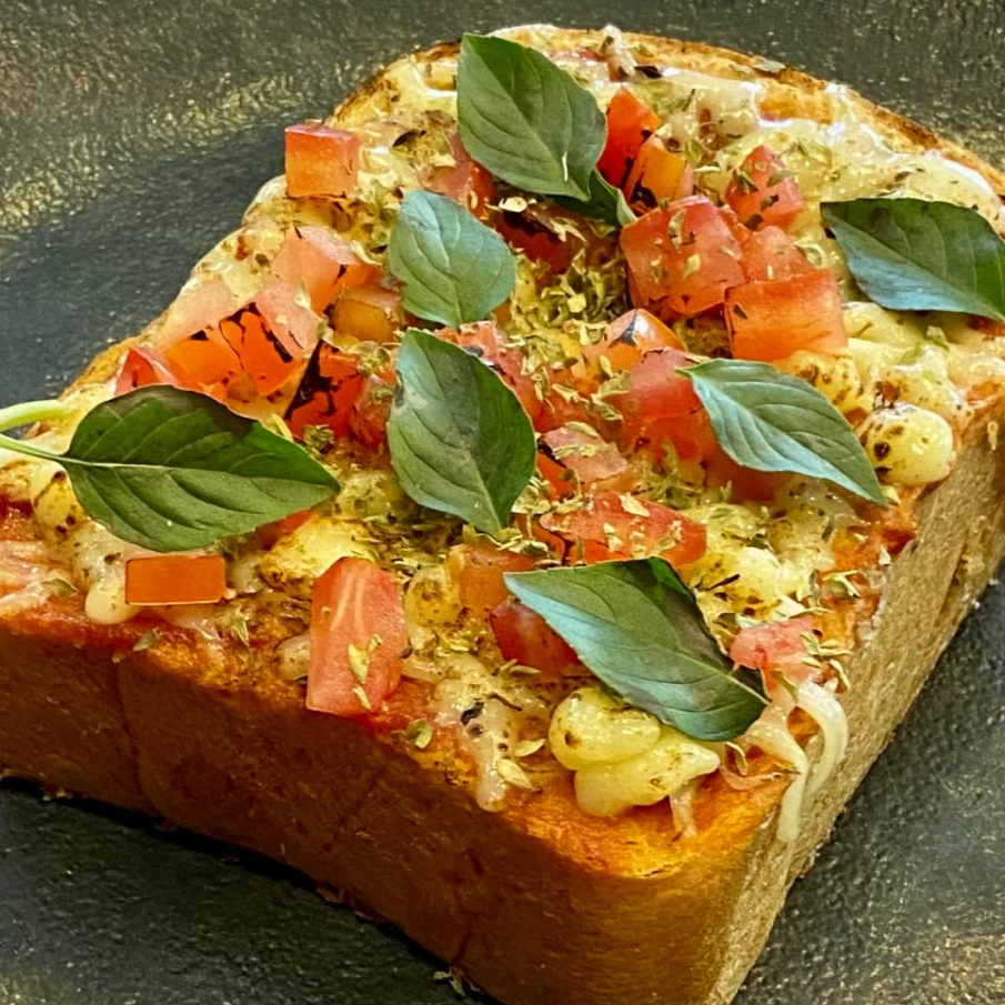 TORRADA PETRÓPOLIS NA MATEIGA COM MOLHO DE TOMATE ARTESANAL, MUÇARELA, TOMATE ITALIANO E MANJERICÃO