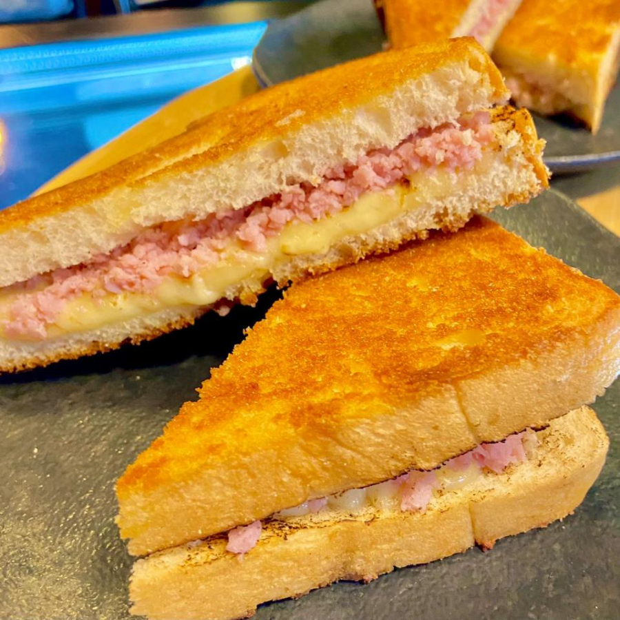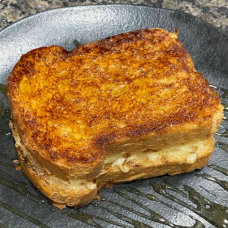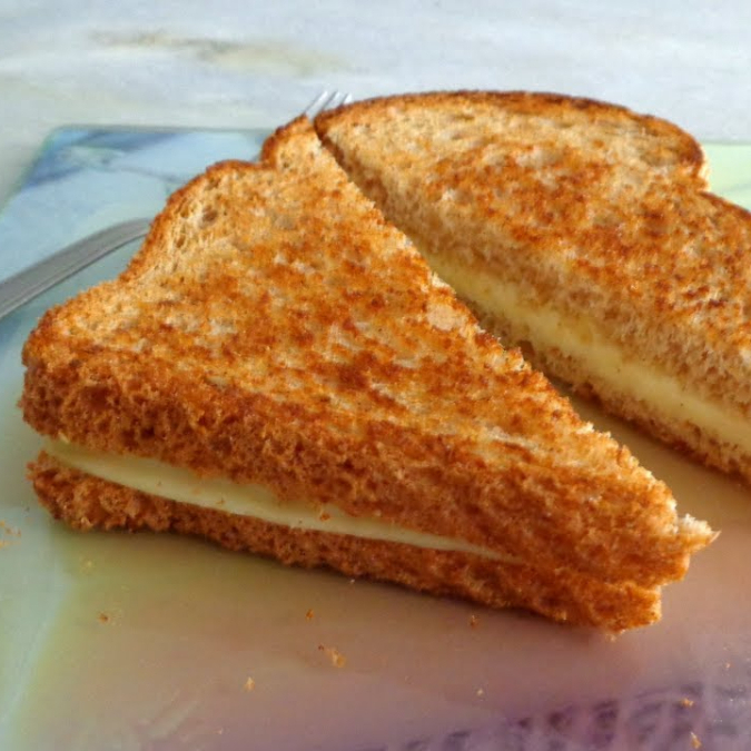 PÃO DE FORMA PETRÓPOLIS NA MANTEIGA RECHEADO COM MUÇARELA, TIRAS DE BANANA GRELHADA COM UM TOQUE DE MEL E CANELA