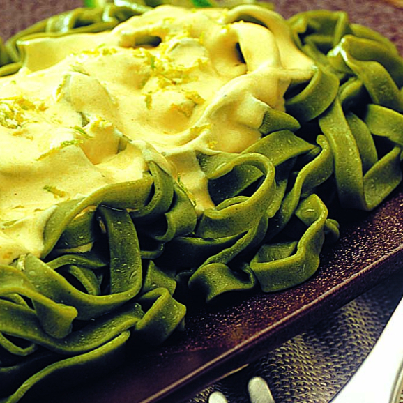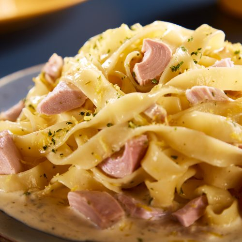 Fettuccine tradicional ao molho branco com atum em pedaços, azeitonas pretas fatiadas e folhas frescas de manjericão.