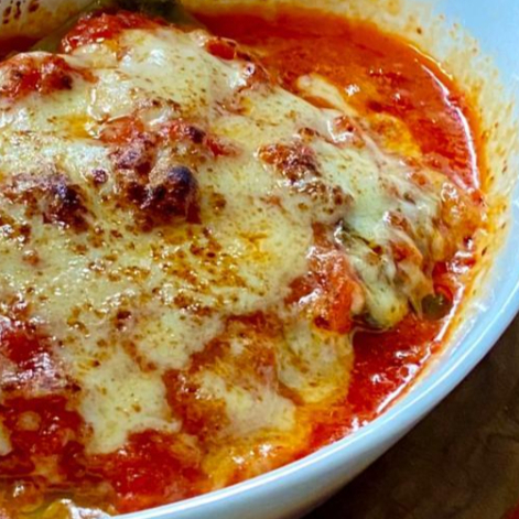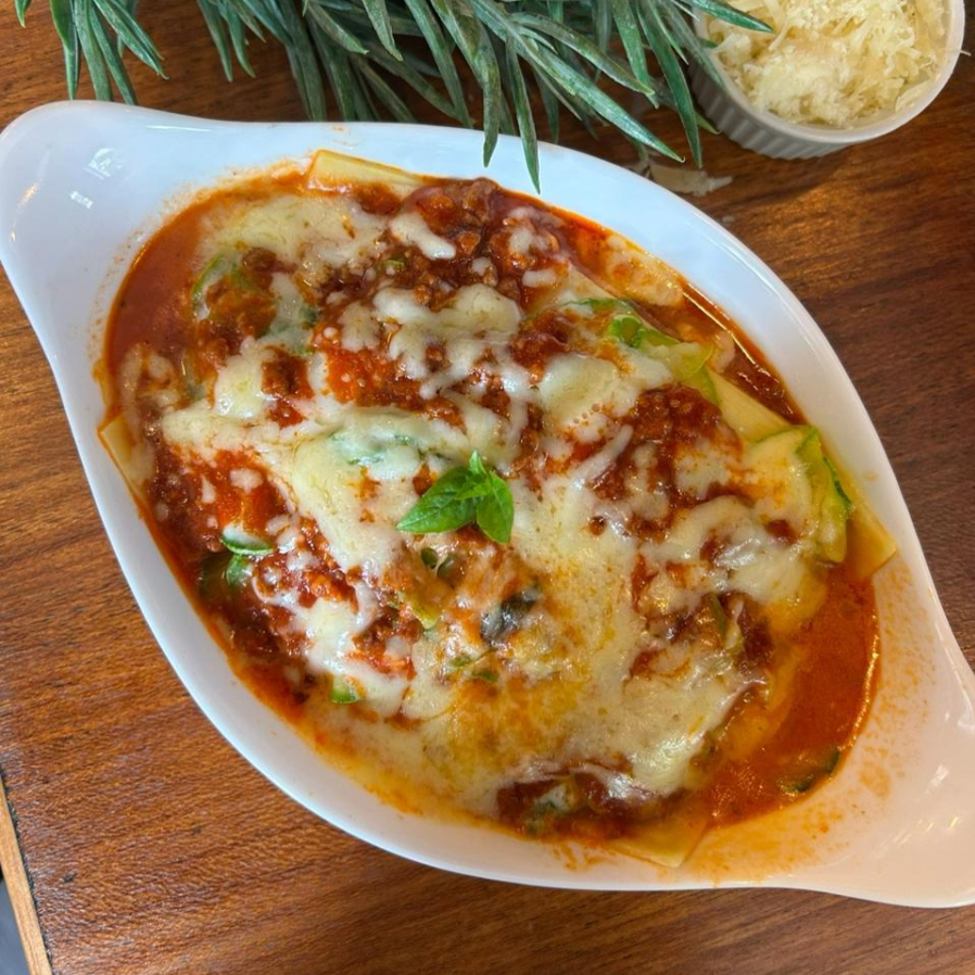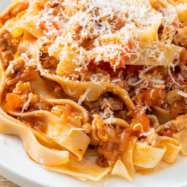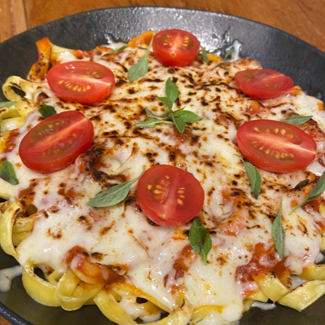 FETTUCCINE TRADICIONAL AO MOLHO SUGO COM MOZZARELLA ESPECIAL GRATINADA, TOMATE CEREJA E MANJERICÃO