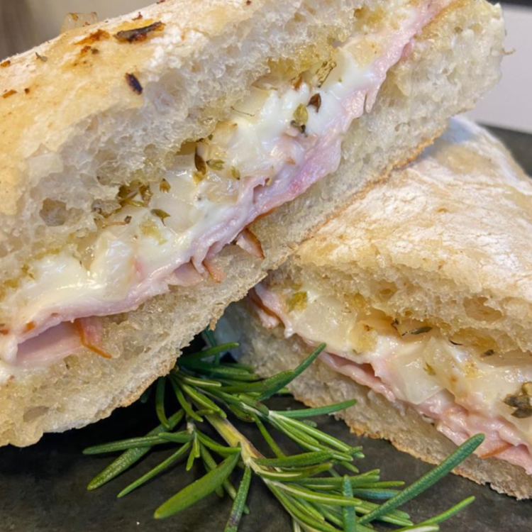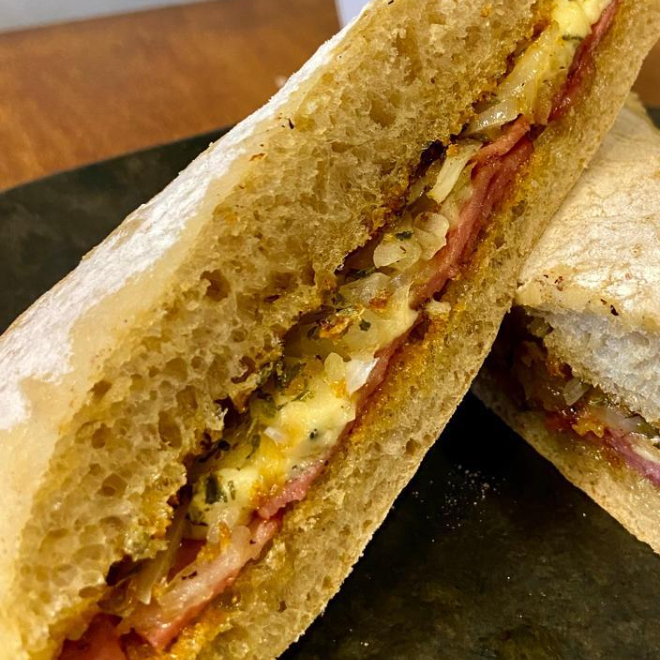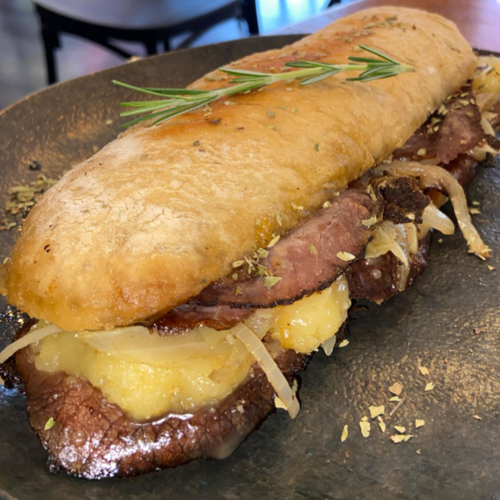 PÃO CIABATTA, ROAST BEEF, PROVOLONE, CEBOLA E ORÉGANO
