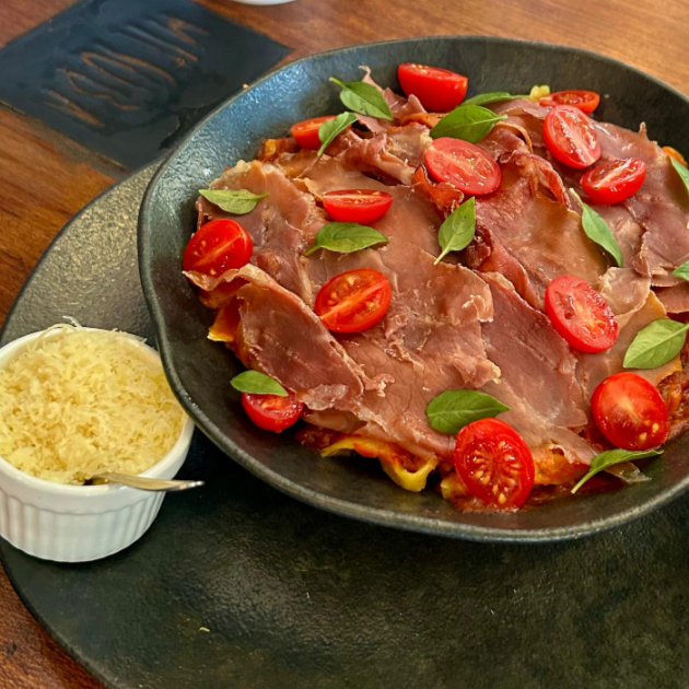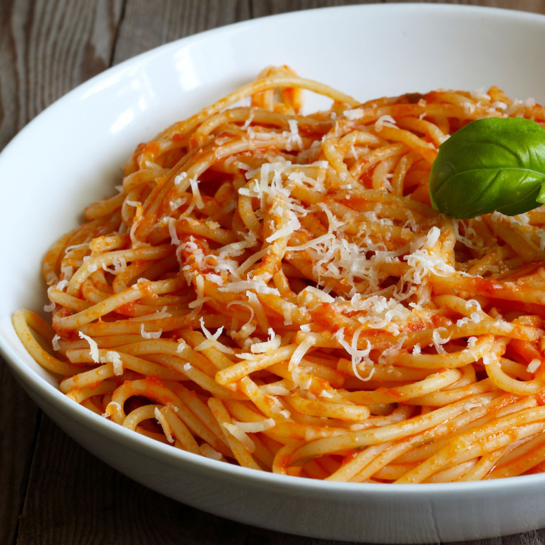 Fettuccine tradicional ao molho sugo com lâminas de presunto di Parma, tomate cereja e folhas frescas de manjericão.