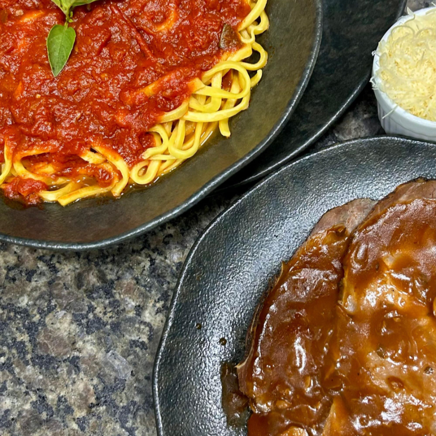 Spaguetti ao molho napolitano com fatias de roast beef ao molho madeira