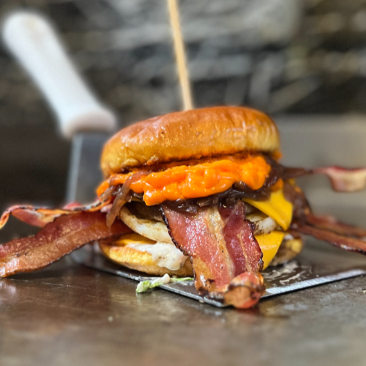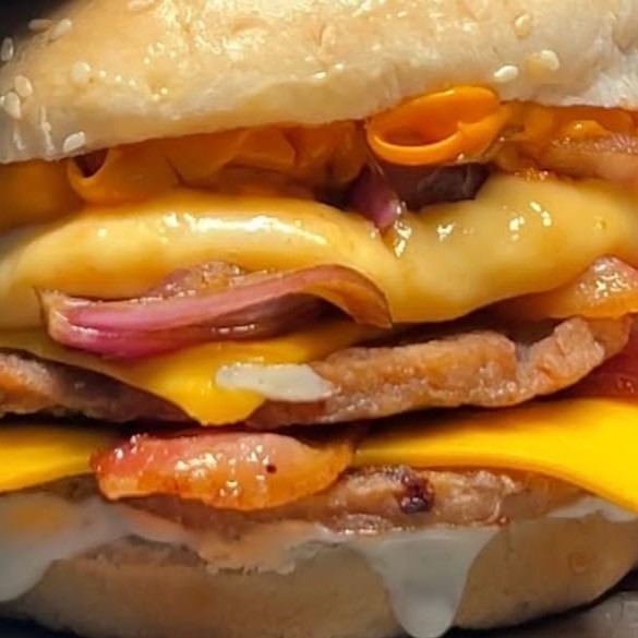 Pão, 2 Carnes, Queijo Cheddar, Ovo, Cheddar Cremoso, 4 Fatias De Bacon, Cebola Caramelizada E Maionese Do Para
