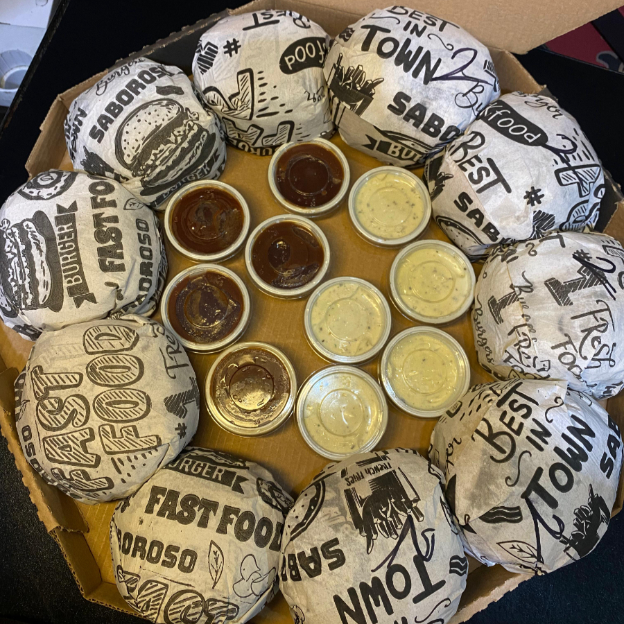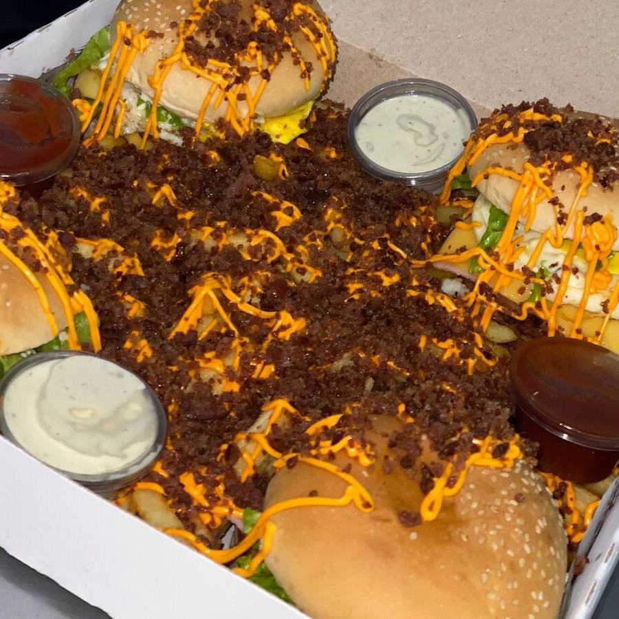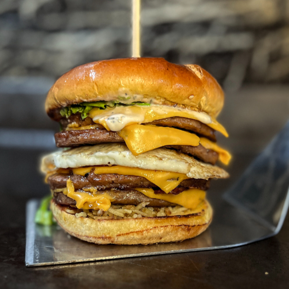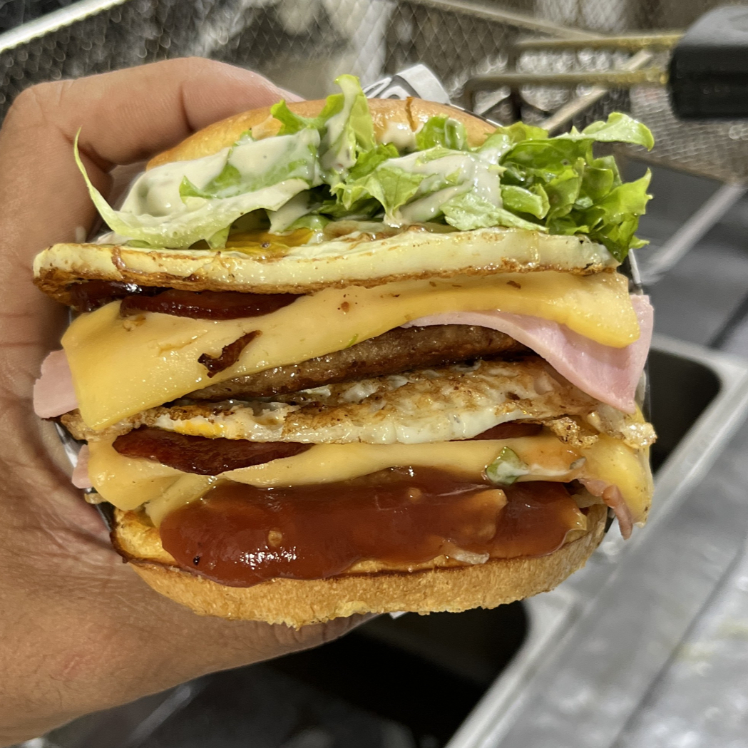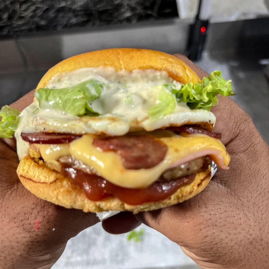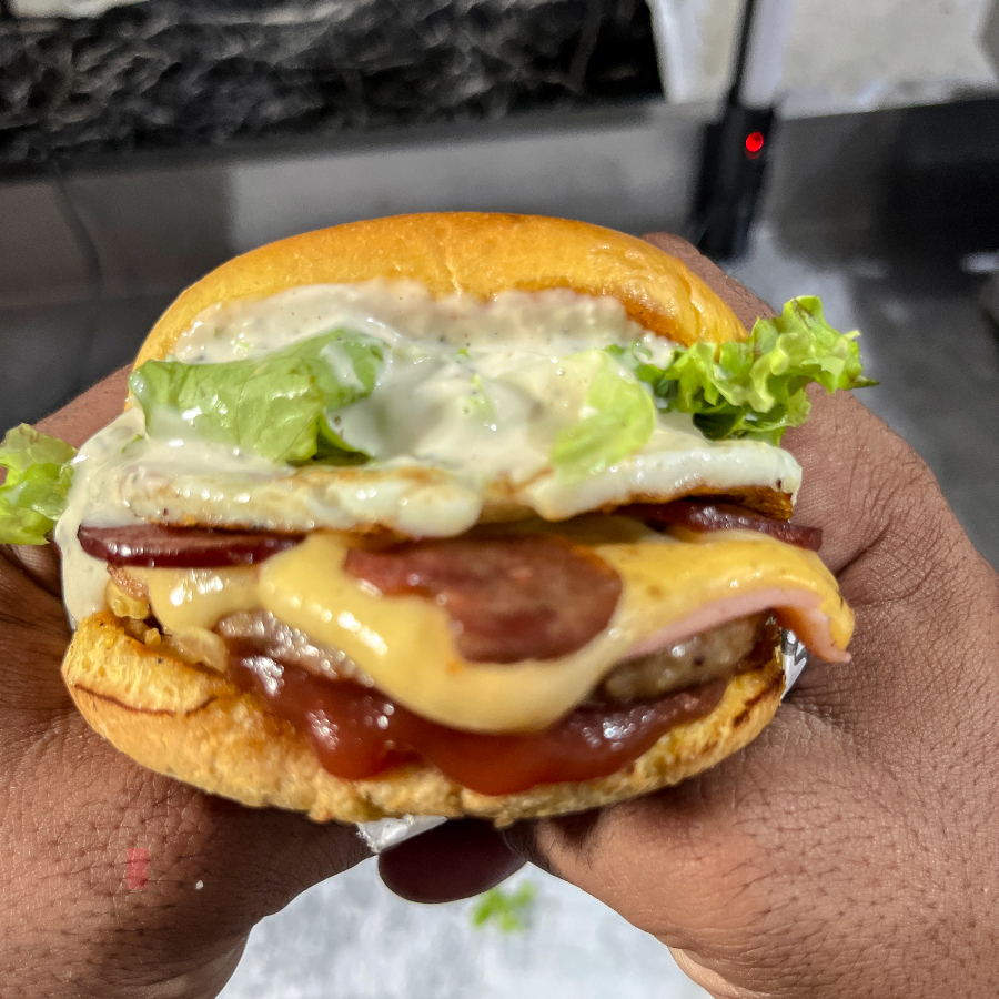 Pão selado recheado com 4 suculentos hambúrgueres, 4 fatias generosas de cheddar cremoso, calabresa grelhada no ponto certo, 1 ovo frito, alface crocante e uma porção caprichada de batata palha. Tudo isso finalizado com o sabor único do nosso ketchup e da maionese do Pará. Um lanche poderoso para quem tem muita fome e muito apetite por sabor!