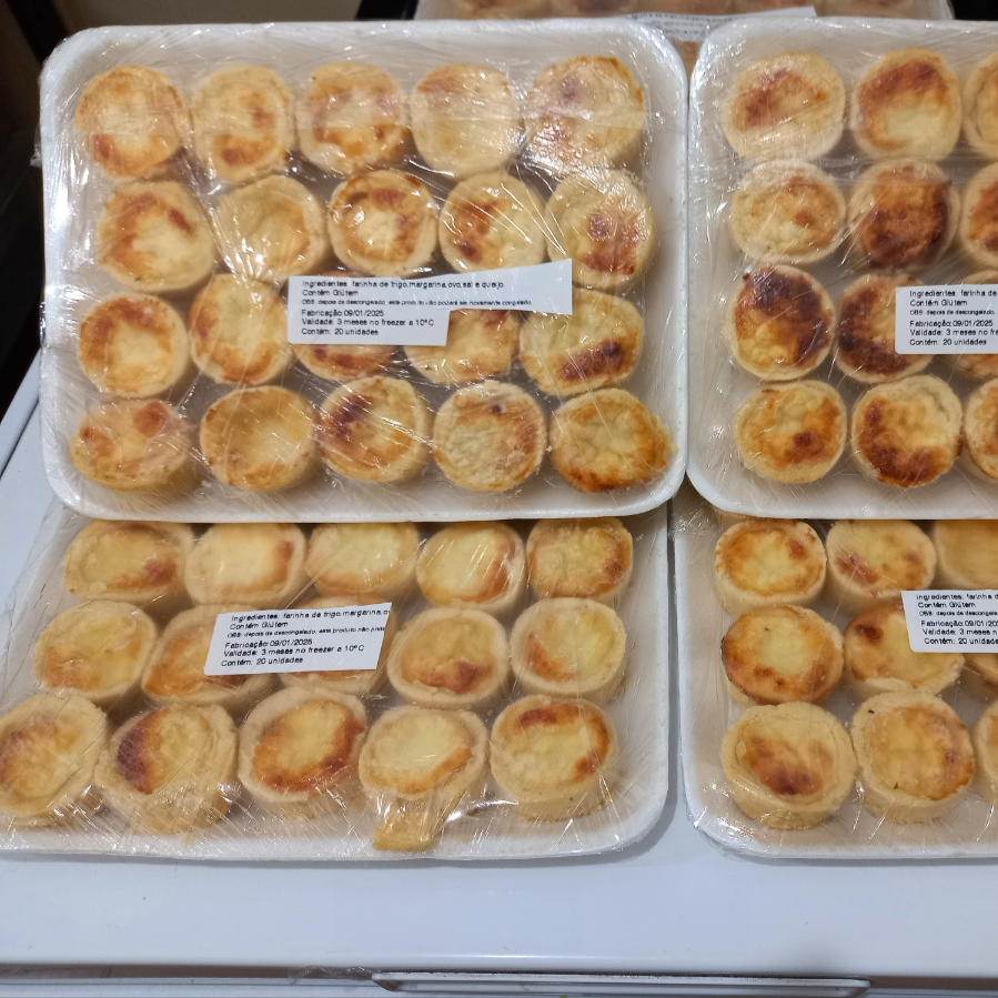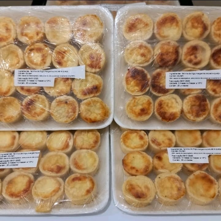 Deliciosa quiche de queijo assada e congelada, apenas aquecer, bandeja com 20 unidades.