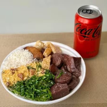 Marmita feijoada magra individual (arroz, carne seca, lombo, costelinha, linguiça calabresa, paio, couve refogado na manteiga, farofa e torresmo). Acompanha refrigerante Coca Cola lata 350ml bem gelada. Marmita indicada para 01 pessoa.