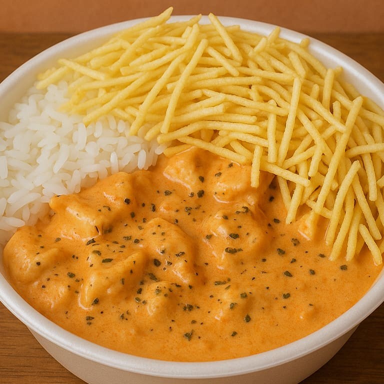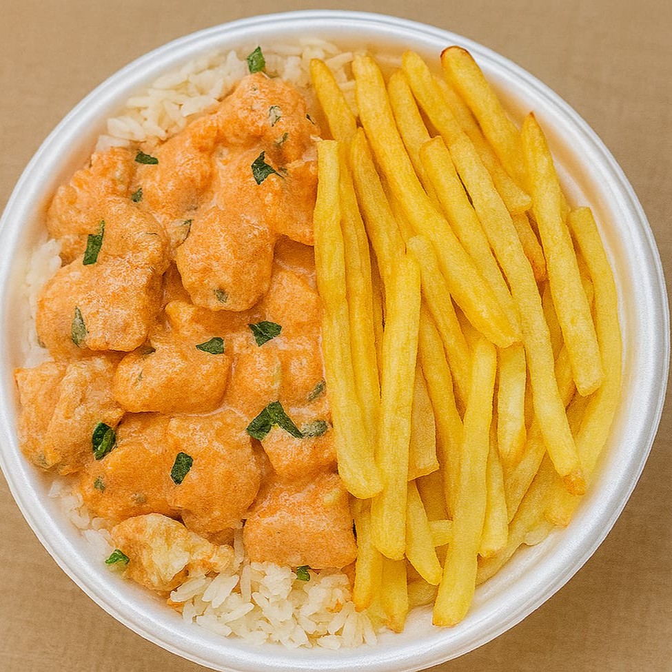 Marmita com delicioso filé de frango ao molho estrogonofe acompanhado de arroz branco e batatas fritas Marmita indicada para 01 pessoa.