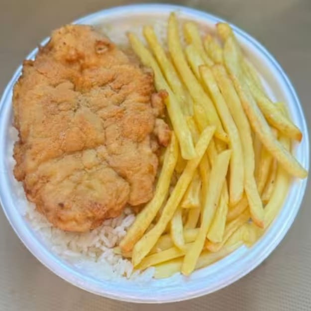 Marmita com delicioso filé de frango empanado na massa crocante acompanhado de arroz branco, feijão e batatas fritas. Marmita indicada para 01 pessoa.
