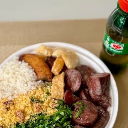 Feijoada completinha e caprichada pra dividir! Preparada com carne seca, lombo, linguiça calabresa, paio e costelinha. Servida com arroz branco, couve refogada, farofa e torresmo crocante.