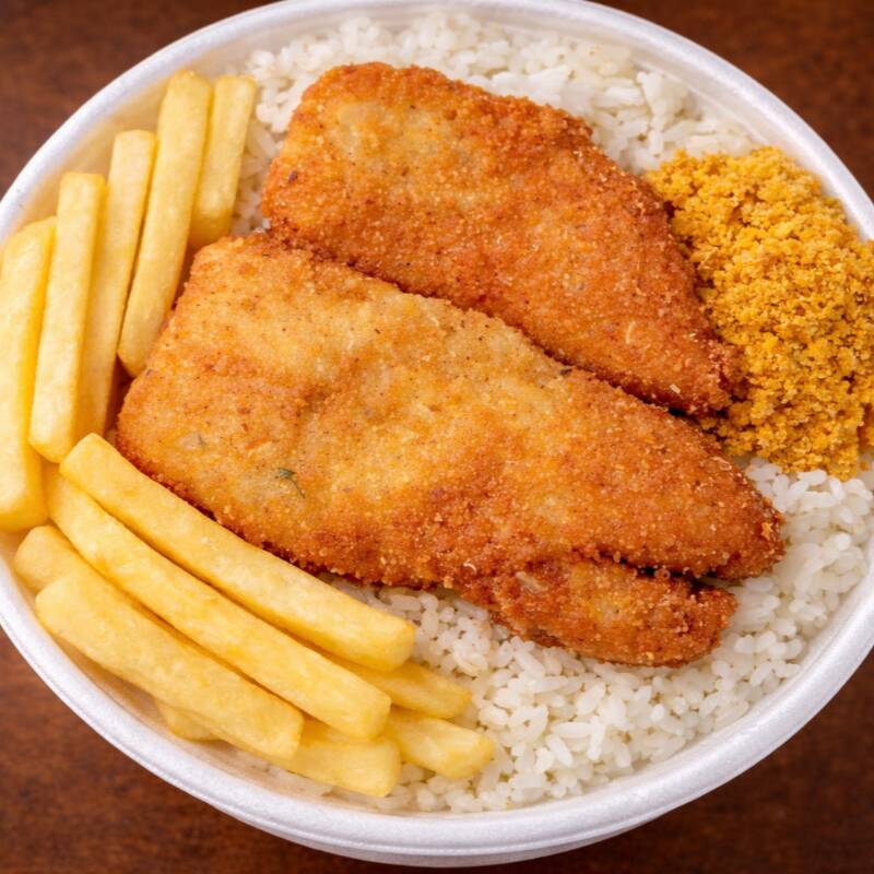Delicioso filé de peixe empanado e crocante, servido com arroz soltinho, feijão caseiro, farofa temperada e batata frita douradinha. Marmita completa, sabor de comida caseira!
