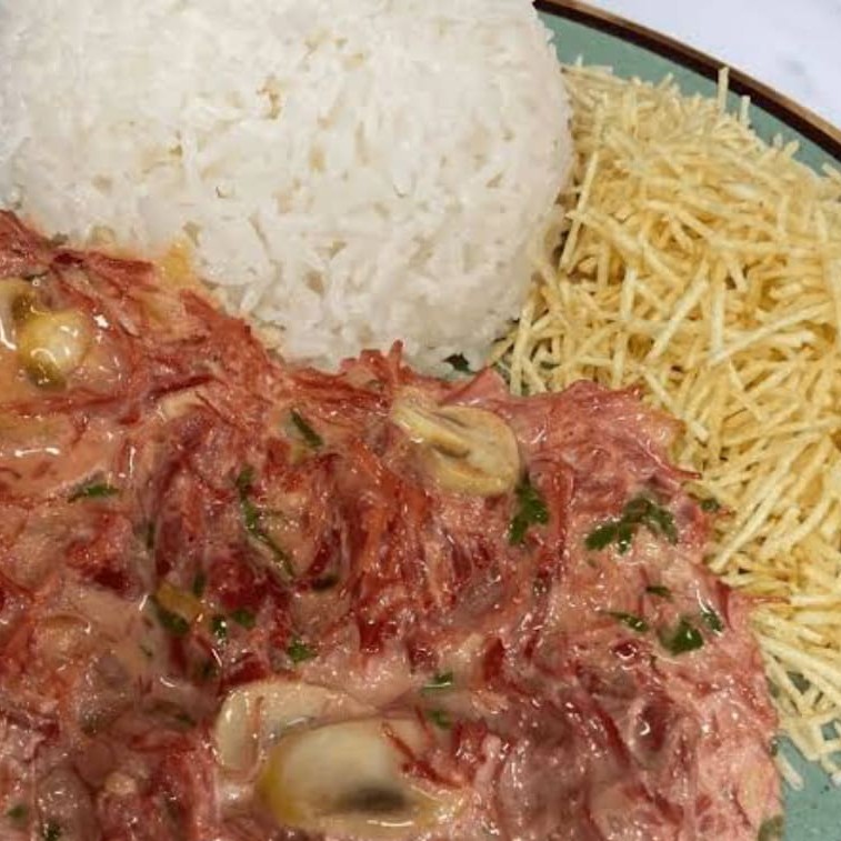 Estrogonofe de carne de sol+ arroz + batata palha