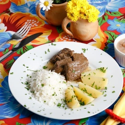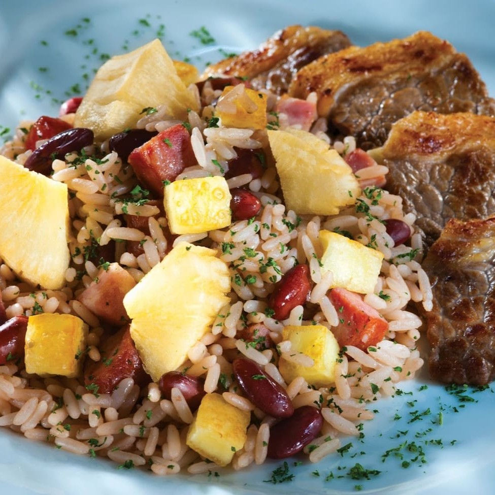 Prato individual com uma deliciosa carne de sol, nosso famoso baião de dois e aipim cozido.