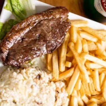 Delicie-se com o nosso 'Bifinho com Batata Canoa', parte do nosso cardápio executivo com bebida. Este prato robusto inclui um bifinho de carne, cuidadosamente picado e grelhado à perfeição, acompanhado por crocantes batatas canoa douradas. O arroz branco, leve e soltinho, e o caldo de feijão, rico e encorpado, completam esta refeição. Para refrescar, a oferta inclui um Guaraná Leão de 300ml, gelado e borbulhante. Uma combinação que agrada aos paladares mais exigentes!