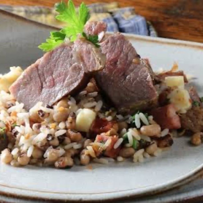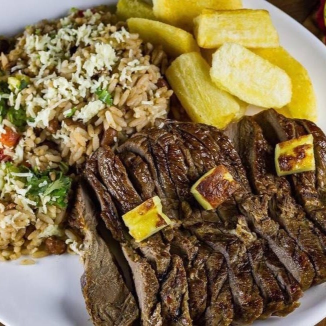 Picanha de sol feita na casa, queijo coalho assado, servidos com Baião de Dois, farofa nordestina, aipim frito, batata frita e molho à campanha.