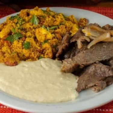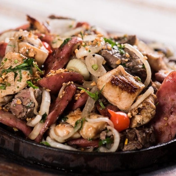 Nossa carne de sol acebolada, linguiça, filé de frango e queijo coalho, servidos com Baião de Dois, farofa nordestina, aipim cozido e molho à campanha