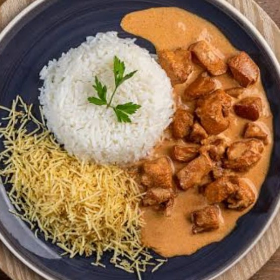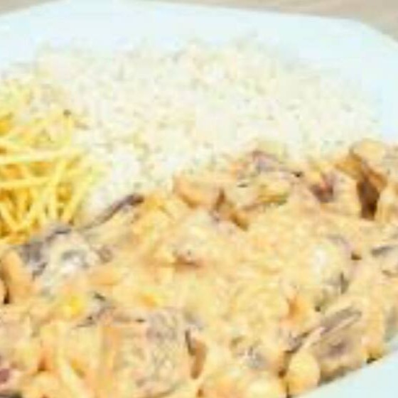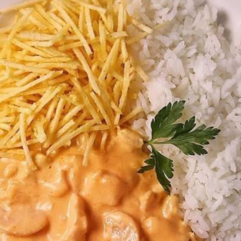 Estrogonofe de frango + arroz + batata palha