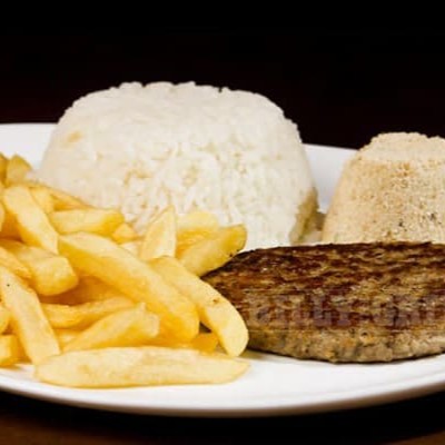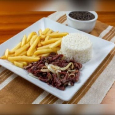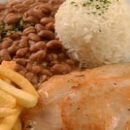 Nosso filé de frango, com arroz branco da casa, feijão preto e deliciosa batata frita