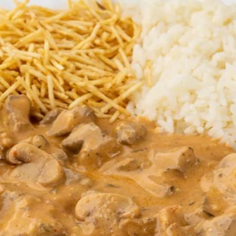 Estrogonofe de carne + arroz + batata palha