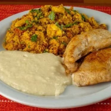 Executivo De Filé De Frango Com Feijão Tropeiro E Aipim Cozido